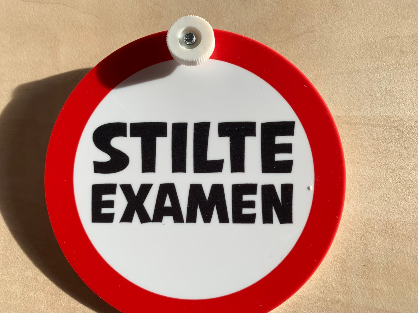 Kunststof verkeersborden of schoolborden met eigen teksten, bijvoorbeeld stilte examen. Voorzien van zuignappen en dus op elke plek te bevestigen.
